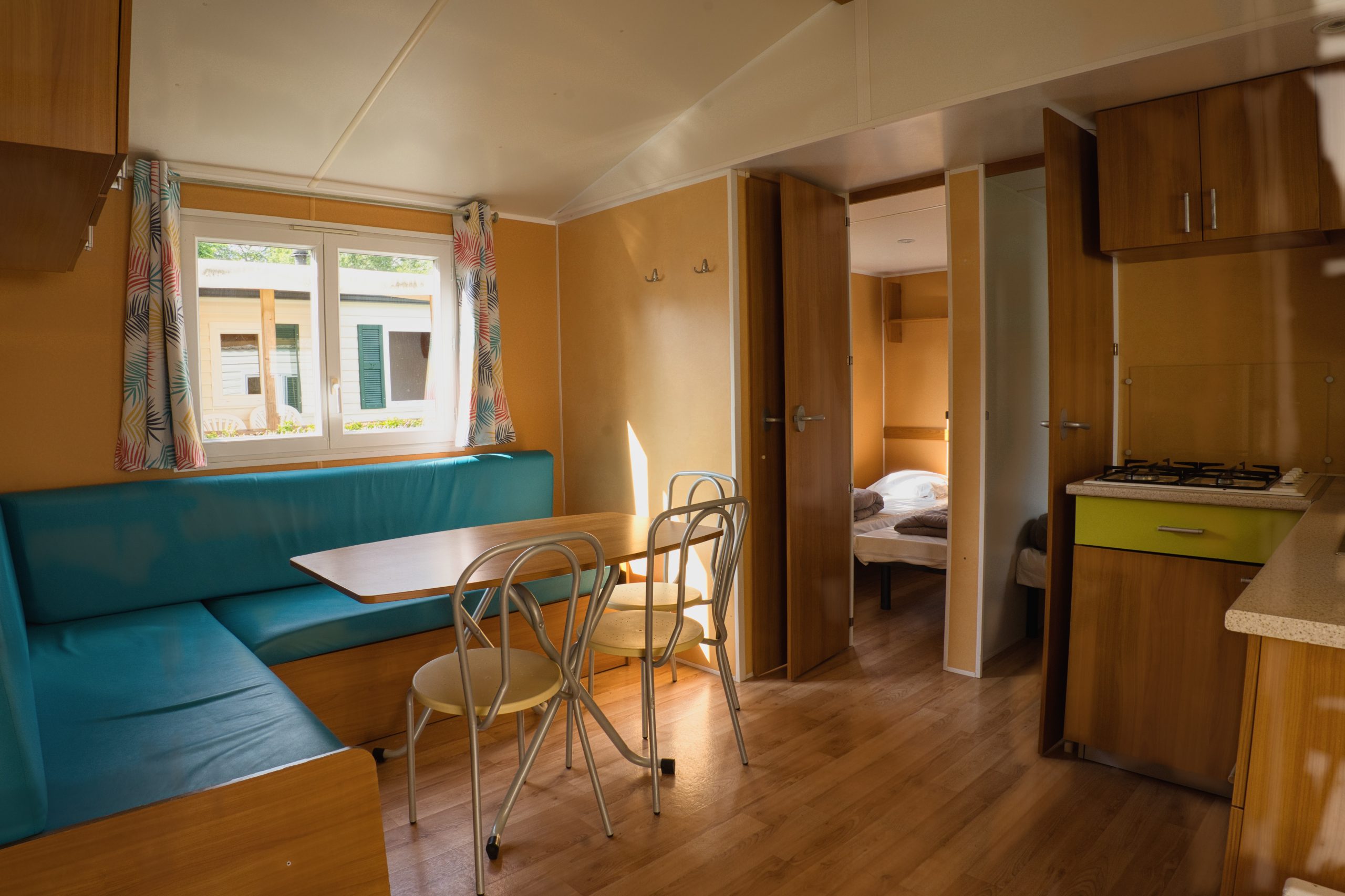 Ce mobil-home de 31 m² , climatisé, est idéal pour les groupes ou les grandes familles grâce à sa configuration modulable. Ses lits simples rapprochables permettent d’adapter l’espace en fonction des besoins, parfait pour accueillir plusieurs couples ou offrir plus de flexibilité.