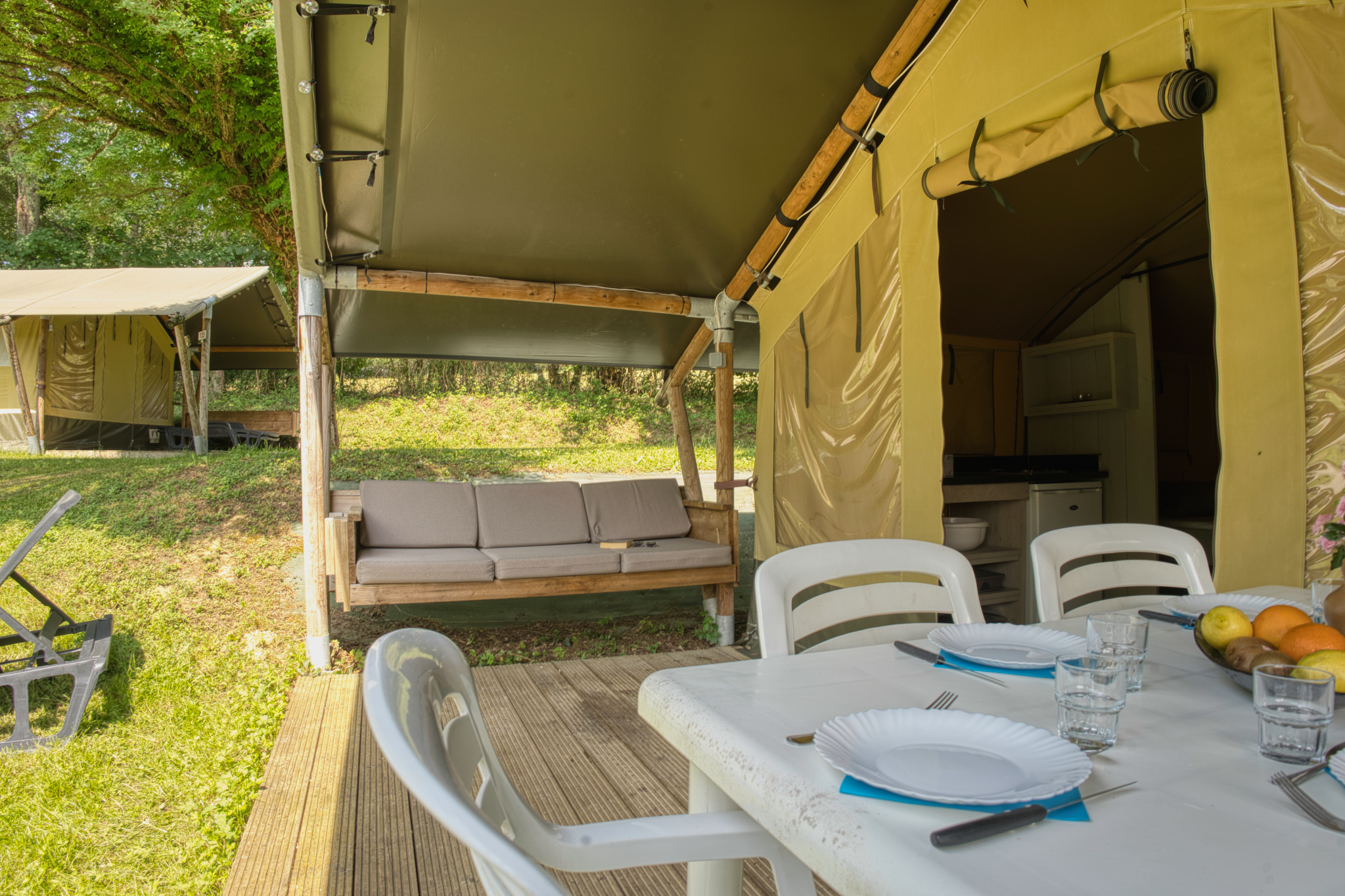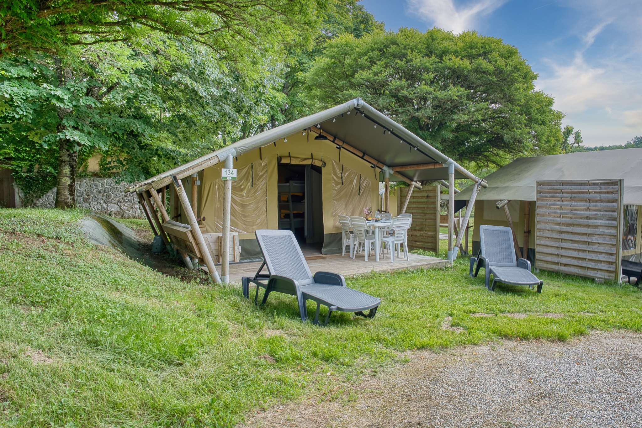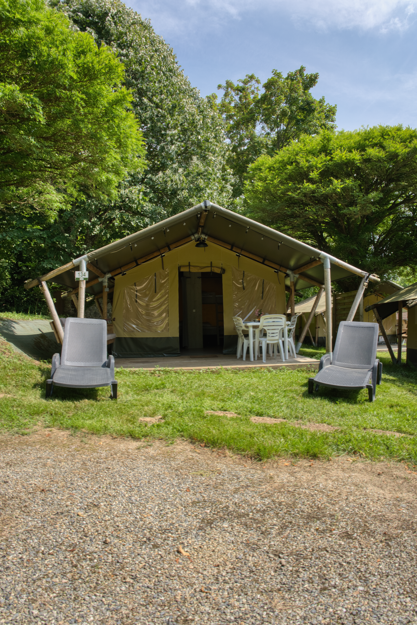 Ces tentes sont idéales pour une famille de 5 personnes avec 3 jeunes enfants . Bien que dépourvues d’eau et de sanitaires privés, elles disposent d’un éclairage, de prises électriques dans chaque espace et d’un coin cuisine équipé de feux gaz, four micro-ondes, cafetière et réfrigérateur. Les blocs sanitaires communs , situés à proximité, assurent toute la commodité nécessaire.