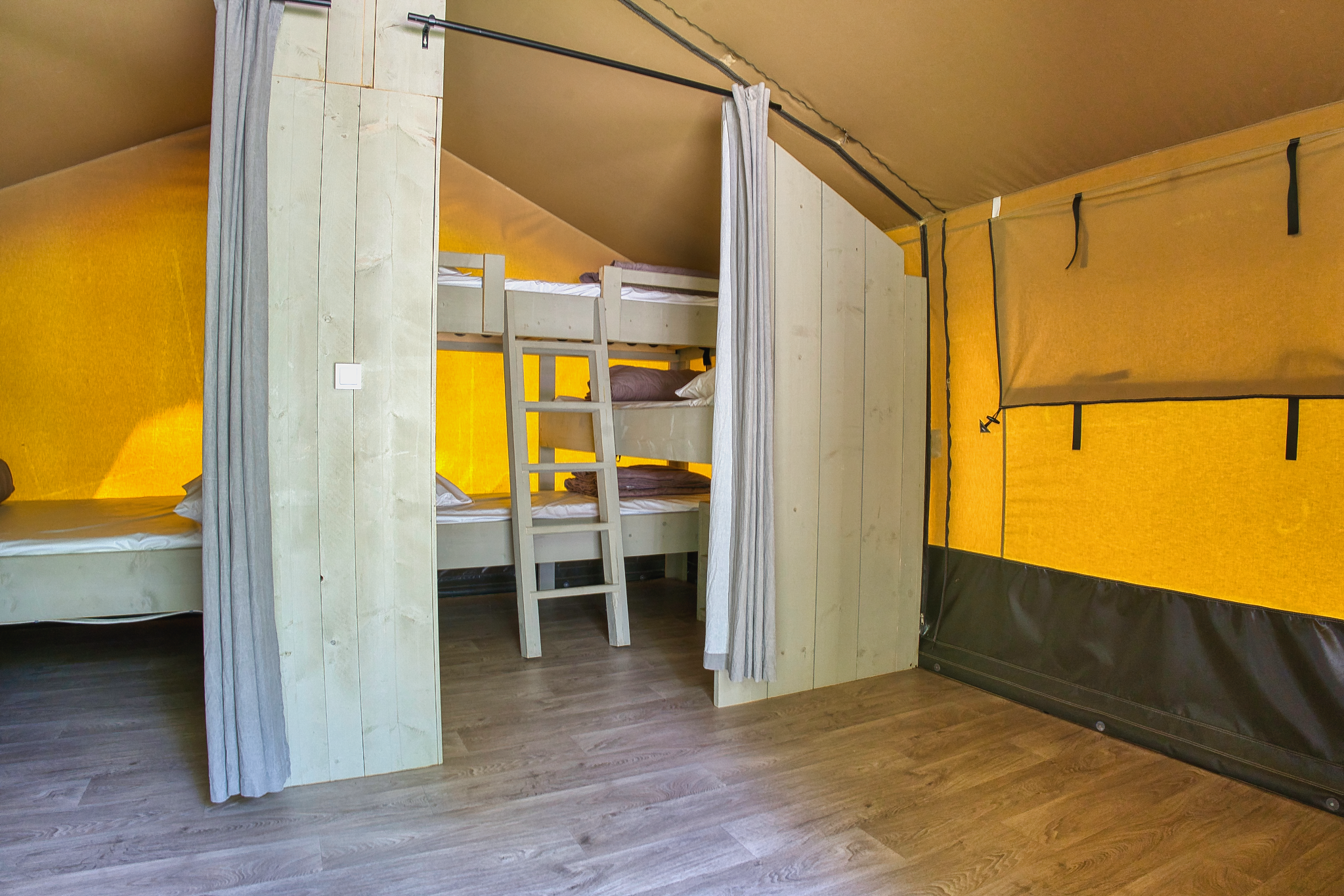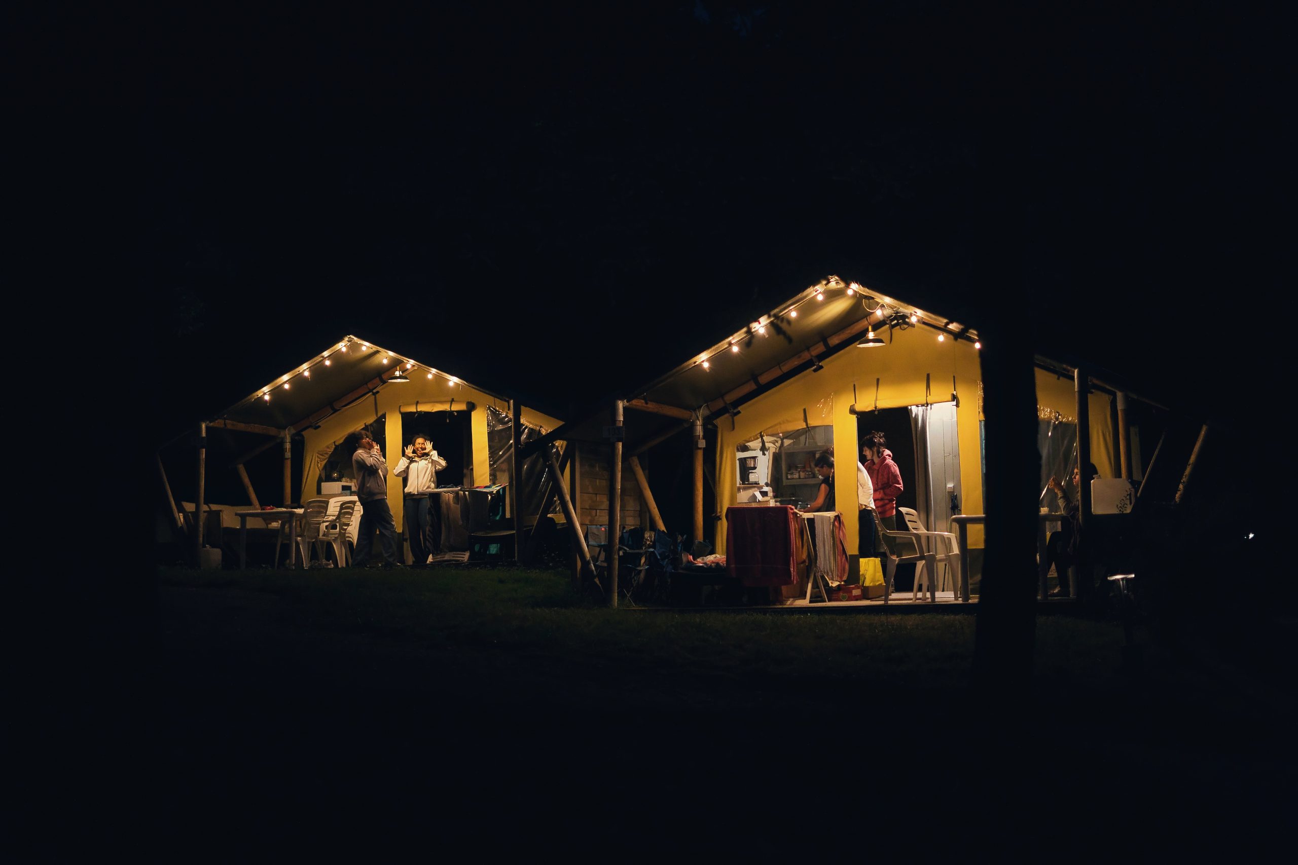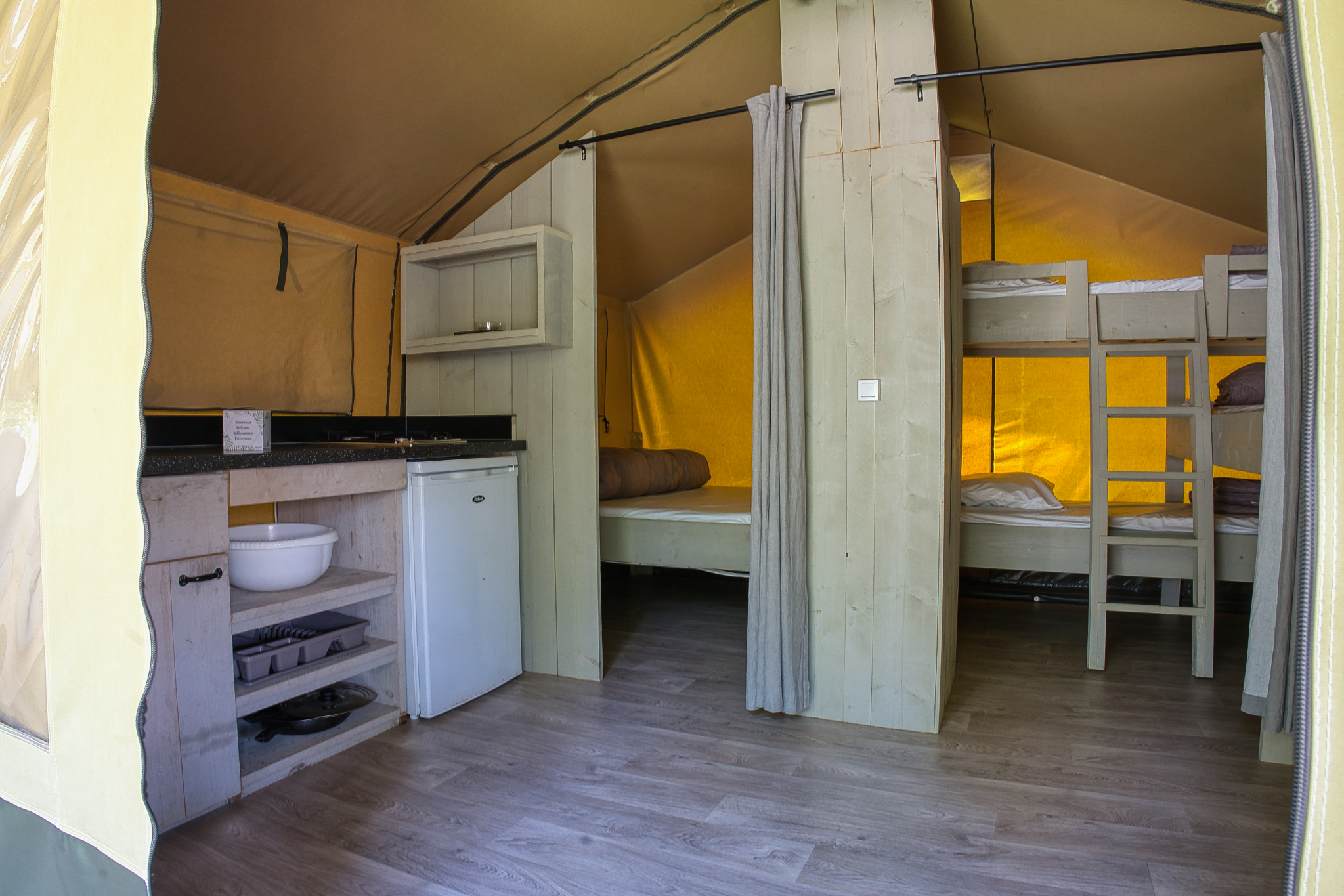 Ces tentes sont idéales pour une famille de 5 personnes avec 3 jeunes enfants . Bien que dépourvues d’eau et de sanitaires privés, elles disposent d’un éclairage, de prises électriques dans chaque espace et d’un coin cuisine équipé de feux gaz, four micro-ondes, cafetière et réfrigérateur. Les blocs sanitaires communs , situés à proximité, assurent toute la commodité nécessaire.