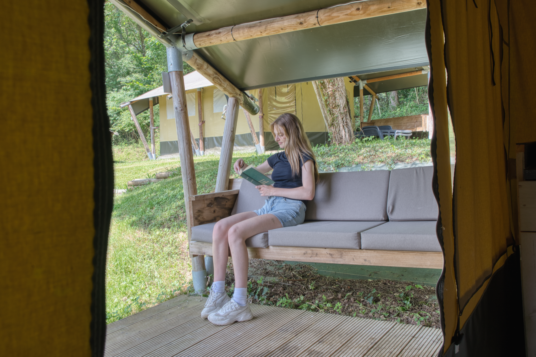 Profitez d’un séjour unique dans nos tentes lodges meublées de 20 m² , au style « Safari » , parfaites pour les aventuriers en quête de nature et de confort . Avec leur terrasse couverte et une banquette en bois , elles offrent un espace convivial et chaleureux.