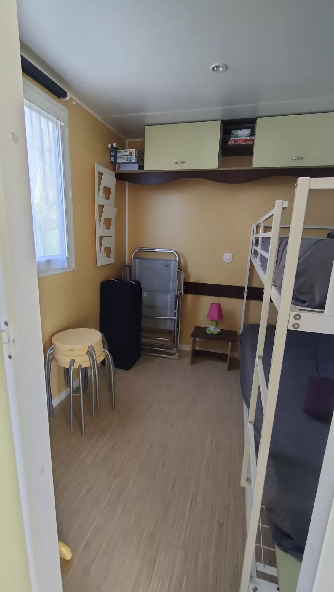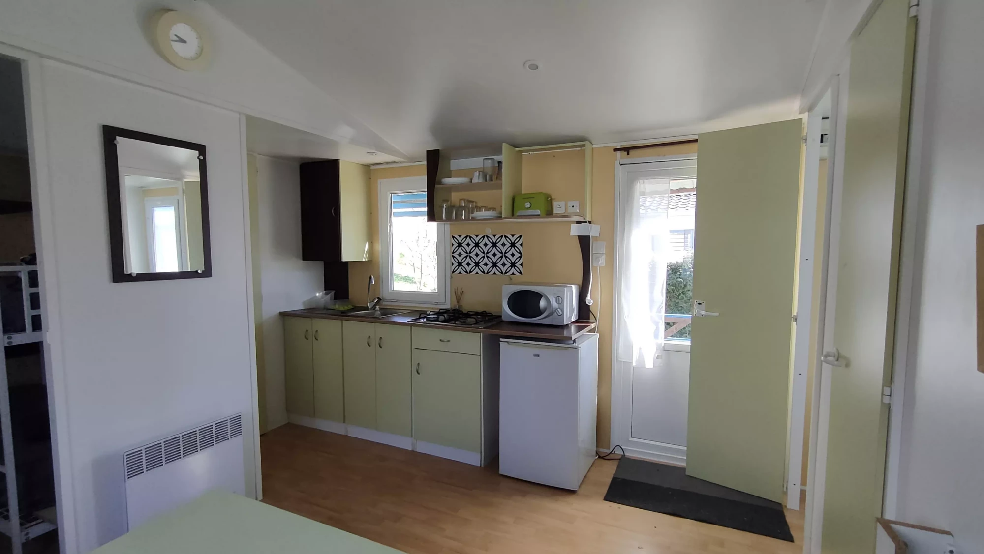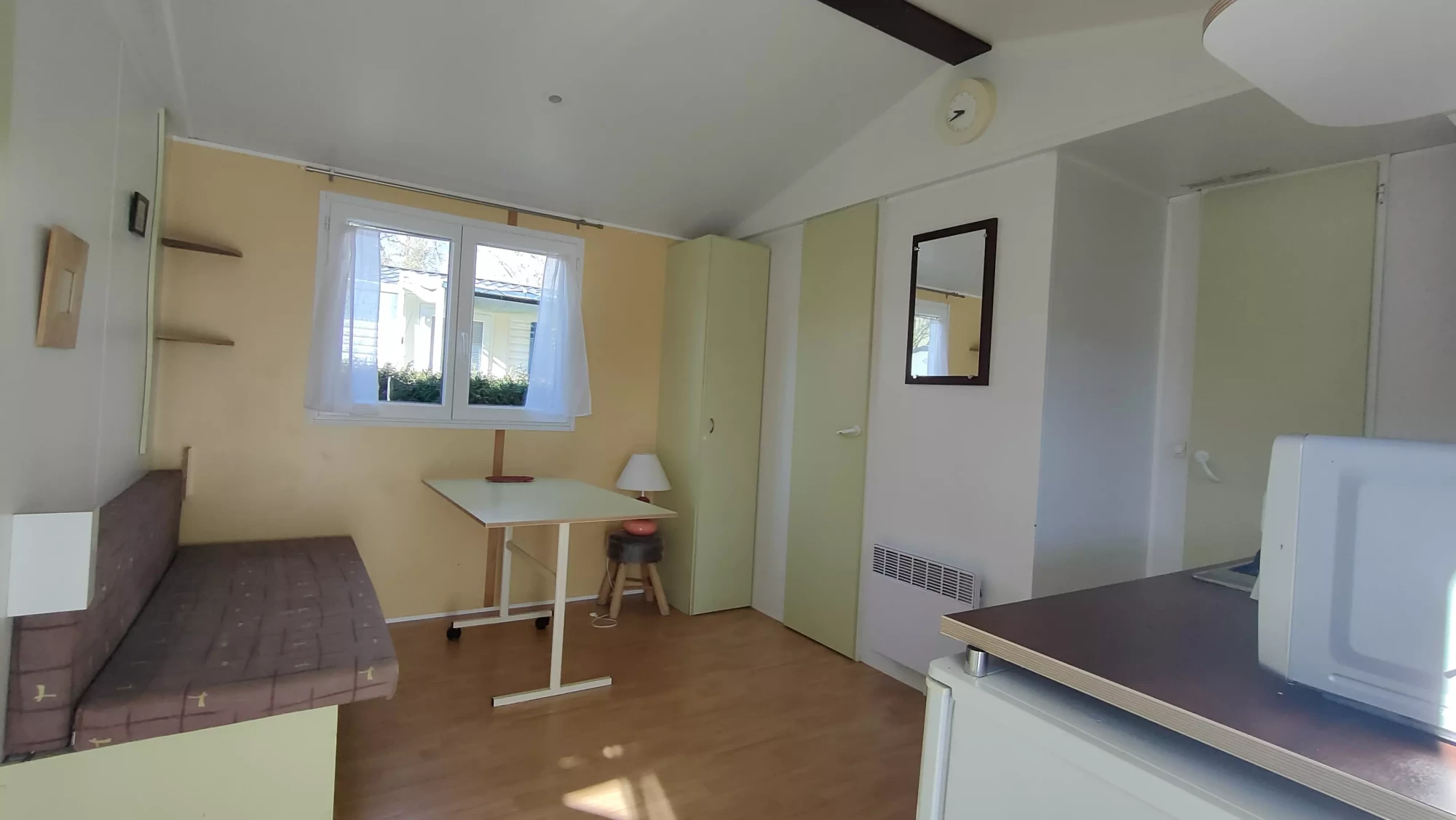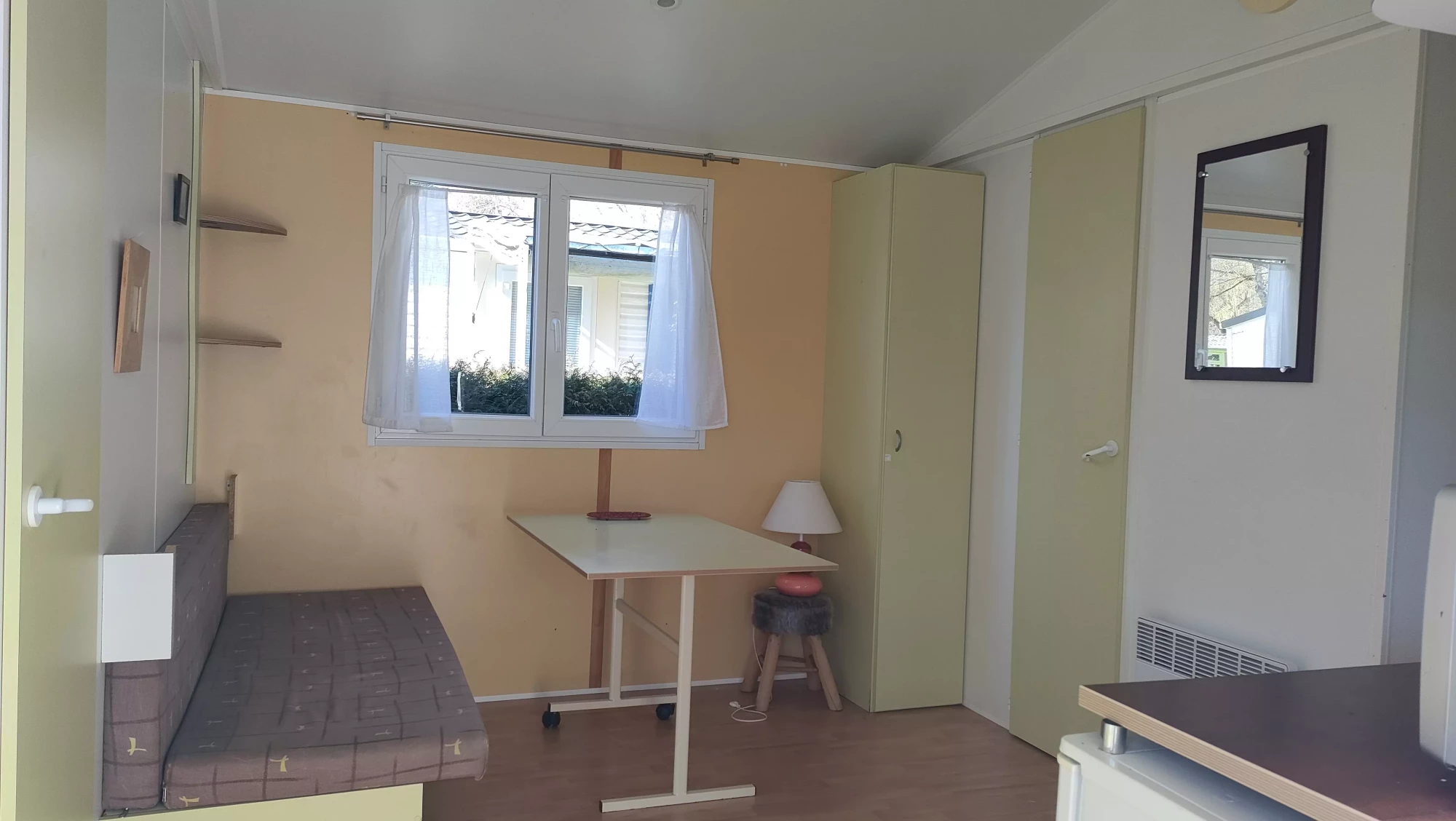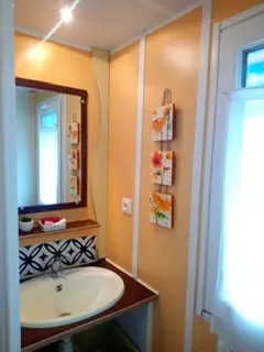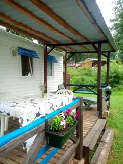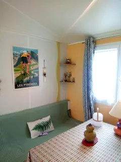 Le mobil-home se compose de 2 chambres pouvant recevoir 4-5 personnes, une banquette, wc douche séparés, tout équipé, salon de jardin Cabanon de jardin, le tout sur un emplacement très calme.