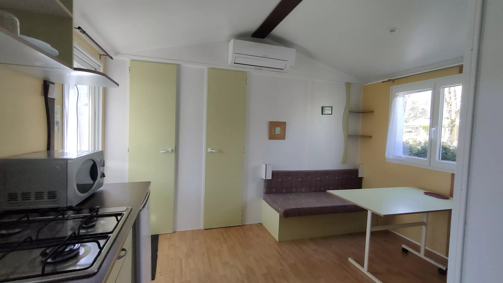 Le mobil-home se compose de 2 chambres pouvant recevoir 4-6 personnes, une banquette, wc douche séparés, tout équipé, salon de jardin, le tout sur un emplacement très calme.