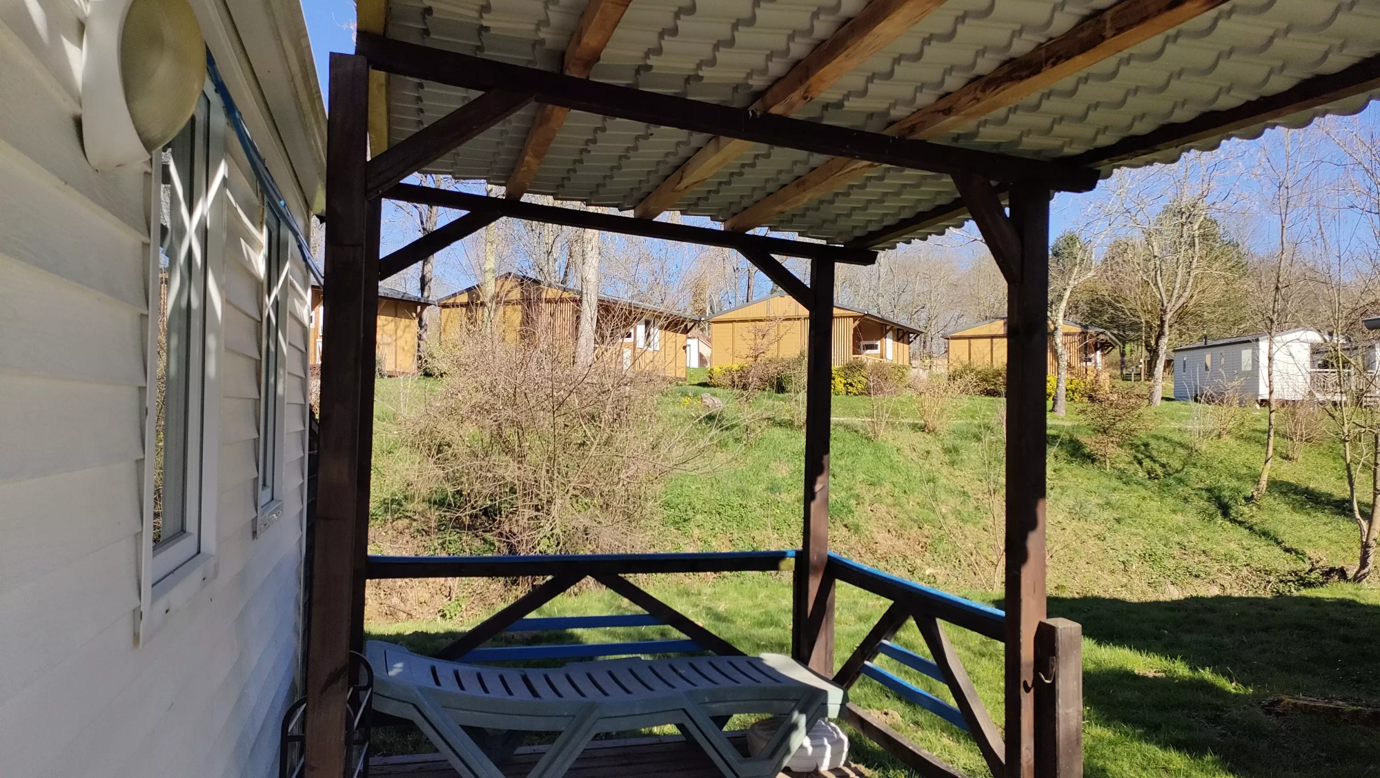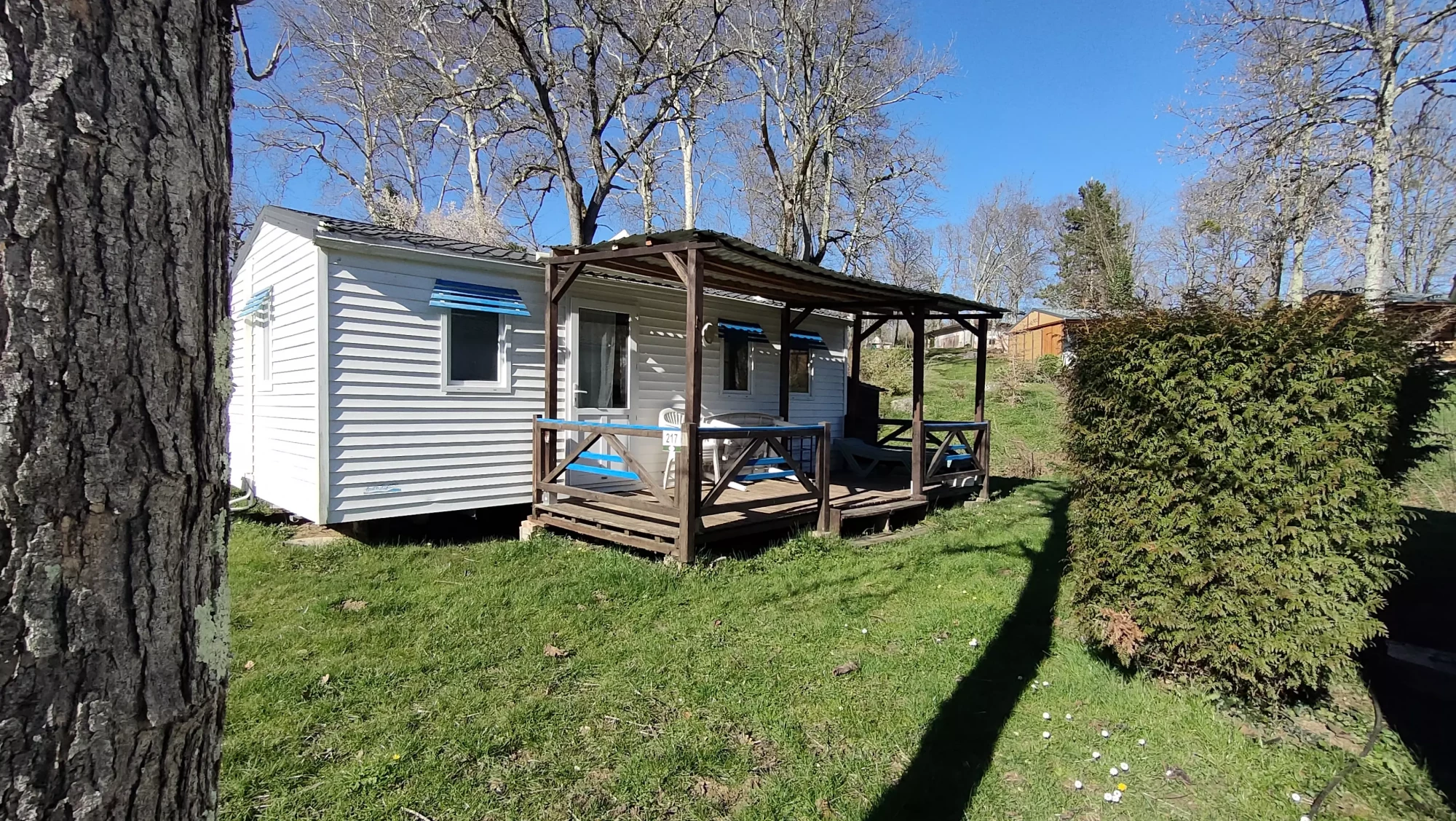 Mobil Home WILLERBY Modèle Kaléda de 40 m2 (année 1994) avec terrasse couverte, sur une parcelle d’environ 100 m2.